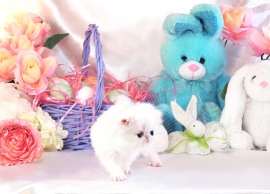 A snow white male doll face Persian kitten. Eyes are predicted to be a stunning ice blue color. He look is perfect in every way ! Stands like a show Persian, flawless in color and facial features. Soft, silky, shiny coat. Gorgeous balance facial features. He is very intelligent, possibly too much! He knows what he wants . . . that is to play and be active. Of course he is a kitten and kittens love that, but he plays like a dog.