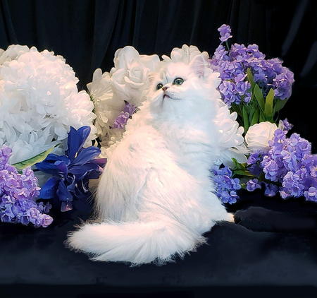 She possesses soft facial features in a Doll Face look with beautiful large eyes ! Her silky free flowing coat is a bright white silver Chinchilla color makes her an ideal breeding Dam for TinyPersians . . . she is still young and it will be 2020 her first litters will arrive with plans of breeding the our gorgeous young " Pooh Bear " !